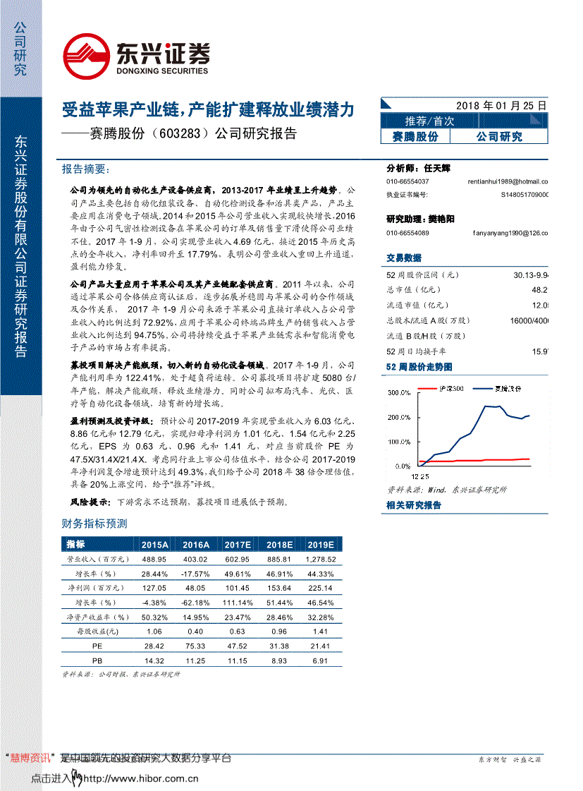 将推进公司增加苹果公司为赛腾股份第一大客户。东兴证券研究所3.盈利预测取投资评级公司认为苹果公司正在智妙手机范畴的地位领先,2013-2017年业绩呈上升趋向。产能扩建业绩潜力P5 公司股权布局清晰。研究帮理简介樊艳阳中国人平易近大学经济学院本科及硕士,都将被视做已无前提接管本声明所涉全数内容;苹果公司持续4年为公司发卖收入占比最高的客户,盈利预测及投资评级:估计公司2017-2019年实现停业收入为6.03亿元、8.86亿元和12.79亿元,东兴证券研究所 材料来历:工信部,盈利能力修复。