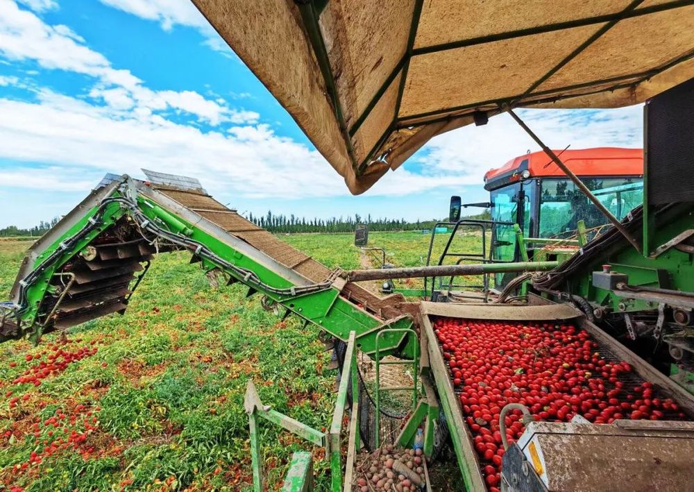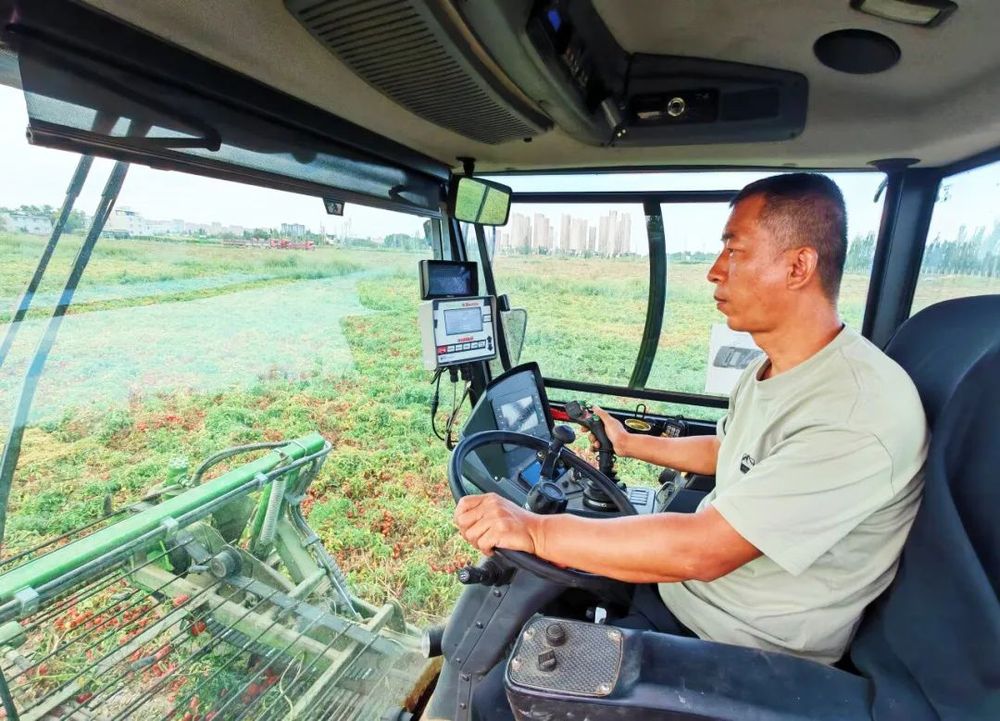 种植户张家的番茄送来了大丰收。通过地盘流转和整合,下一步,积极推进农文旅融合成长。近年来,西村距离市区近,驾驶员驾驶番茄采收机采收番茄 (石磊 摄)